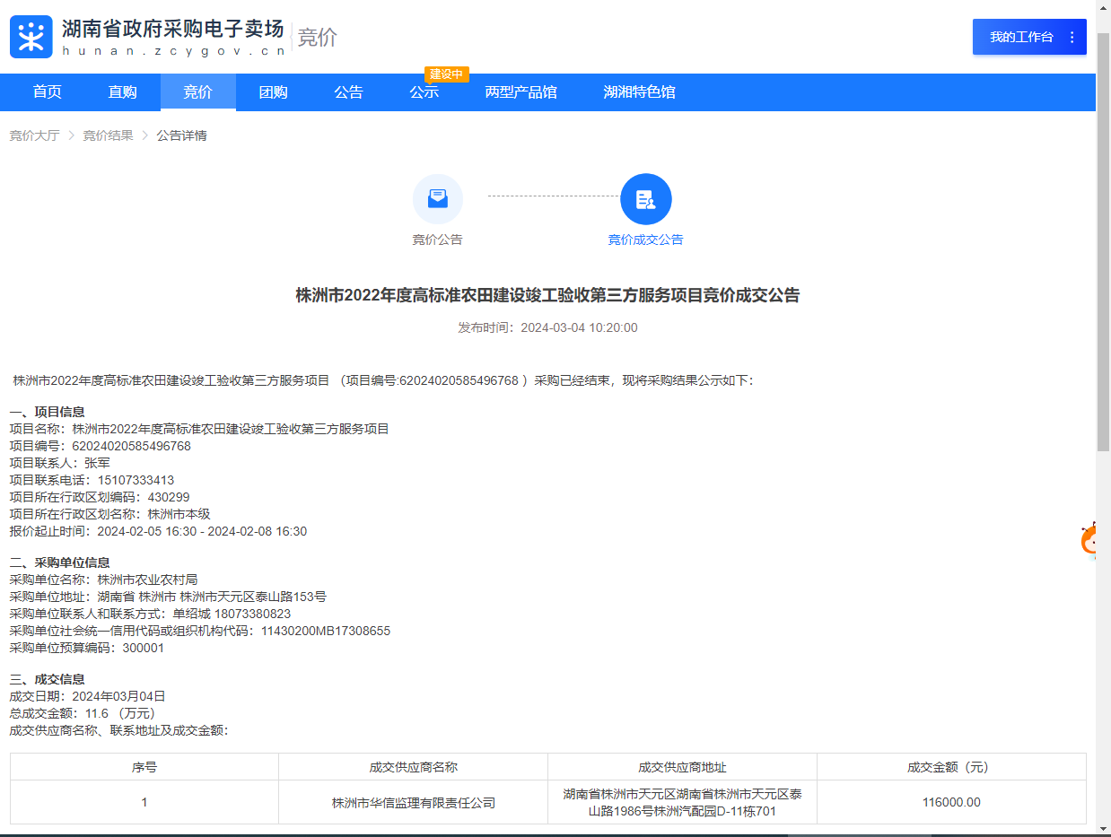 2024年3月4日,“湖南省政府采購(gòu)電子賣場(chǎng)”發(fā)布《株洲市2022年度高標(biāo)準(zhǔn)農(nóng)田建設(shè)竣工驗(yàn)收第三方服務(wù)項(xiàng)目競(jìng)價(jià)成交公告》,顯示株洲市華信監(jiān)理有限責(zé)任公司成為本項(xiàng)目成交供應(yīng)商。這意味著,我公司喜迎龍年“開門紅”。